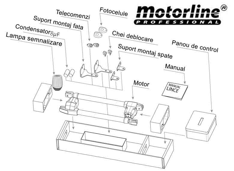Sistemul de automatizare poarta Motorline Lince 300 este disponibil ca un kit complet care include toate accesoriile necesare pentru a fi montat direct pe poarta batanta a dumneavoastra fara probleme: